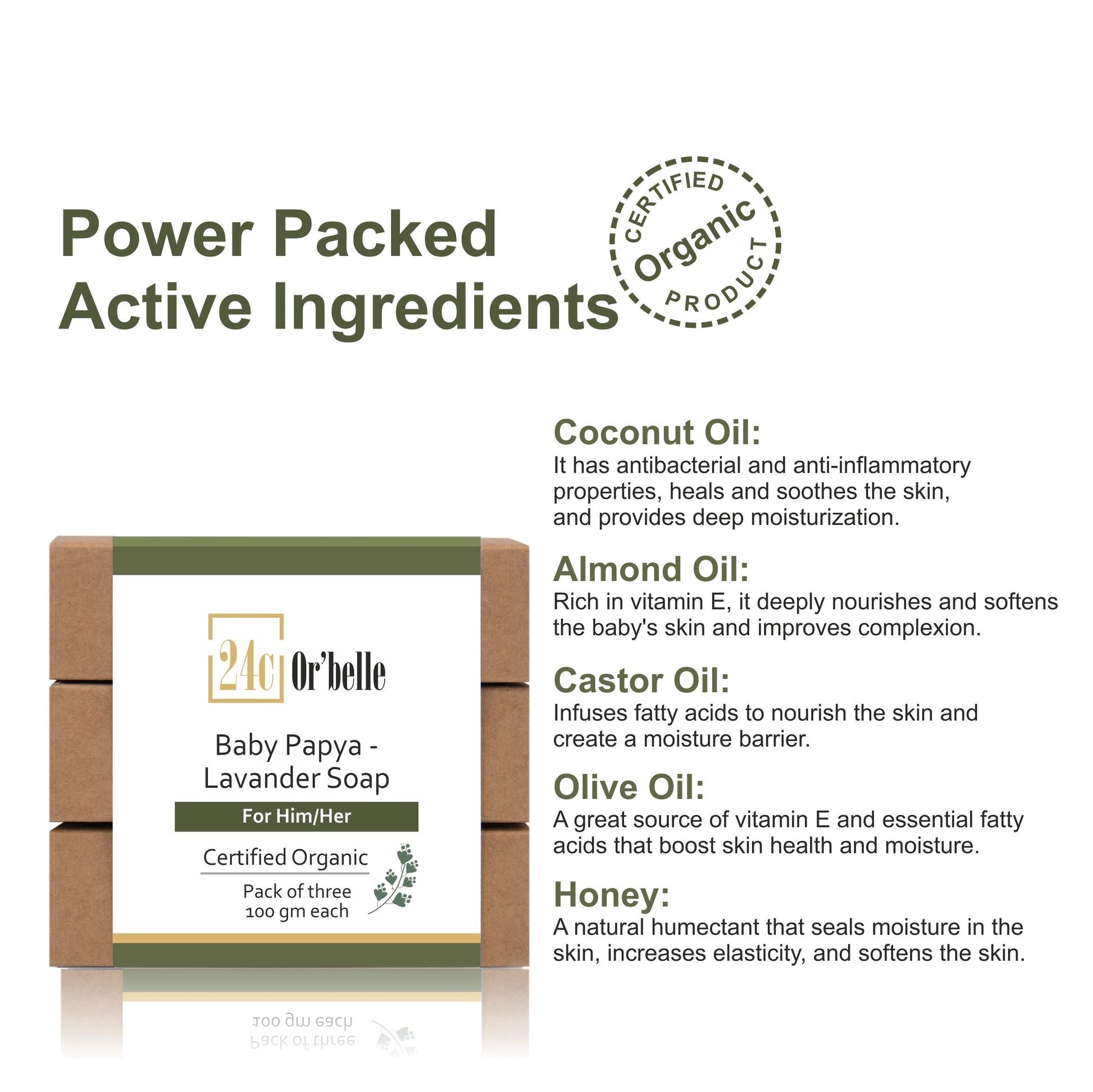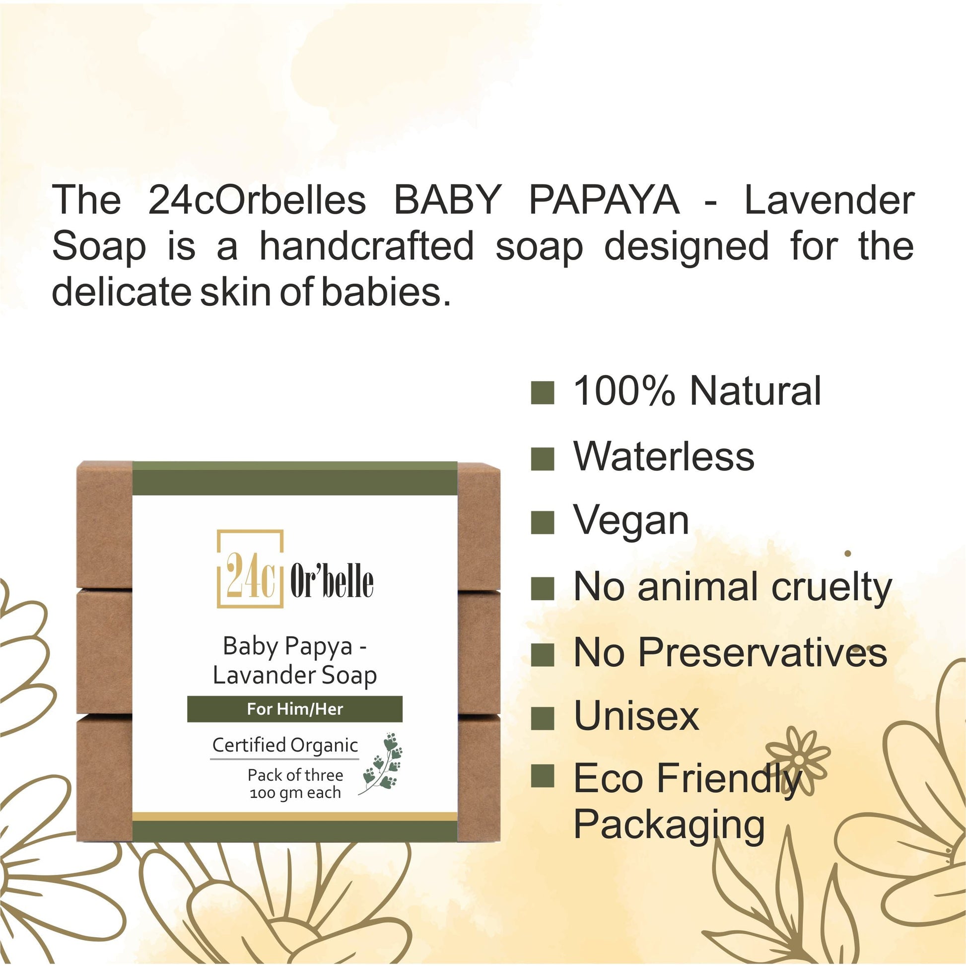 The 24cORBELLE BABY PAPAYA – Lavender Soap is a handcrafted soap designed for the delicate skin of babies. The soap is made using traditional cold processed methods and contains a high percentage of nutrient-rich cold-pressed oils and butters. The ingredients include coconut oil, olive oil, jojoba oil, sunflower oil, almond oil, castor oil, grapefruit essential oil, tomato puree, papaya leaf powder, lavender essential oil, and honey.