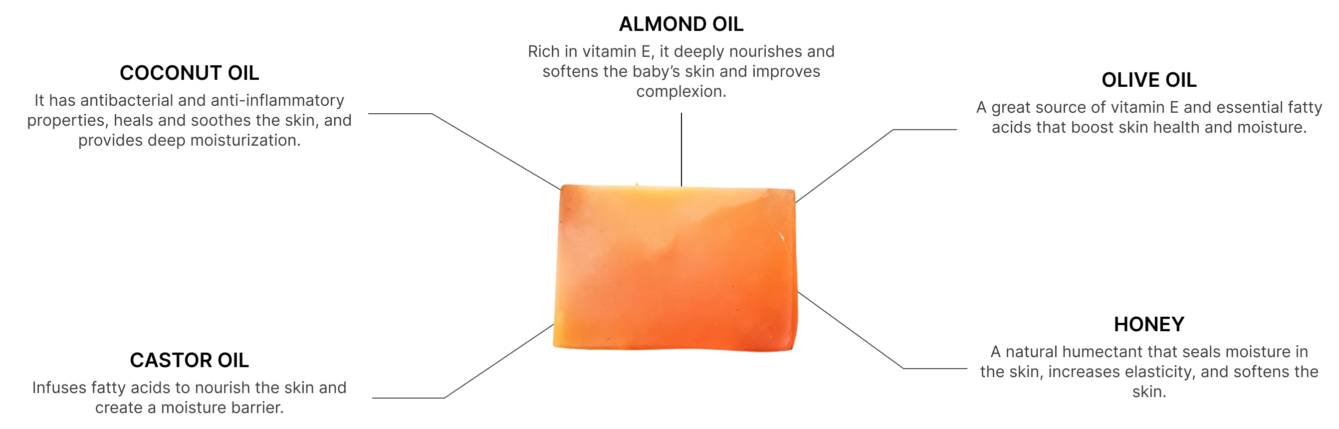 Nourishment: The soap nourishes, moisturises, and cleanses the baby’s skin.