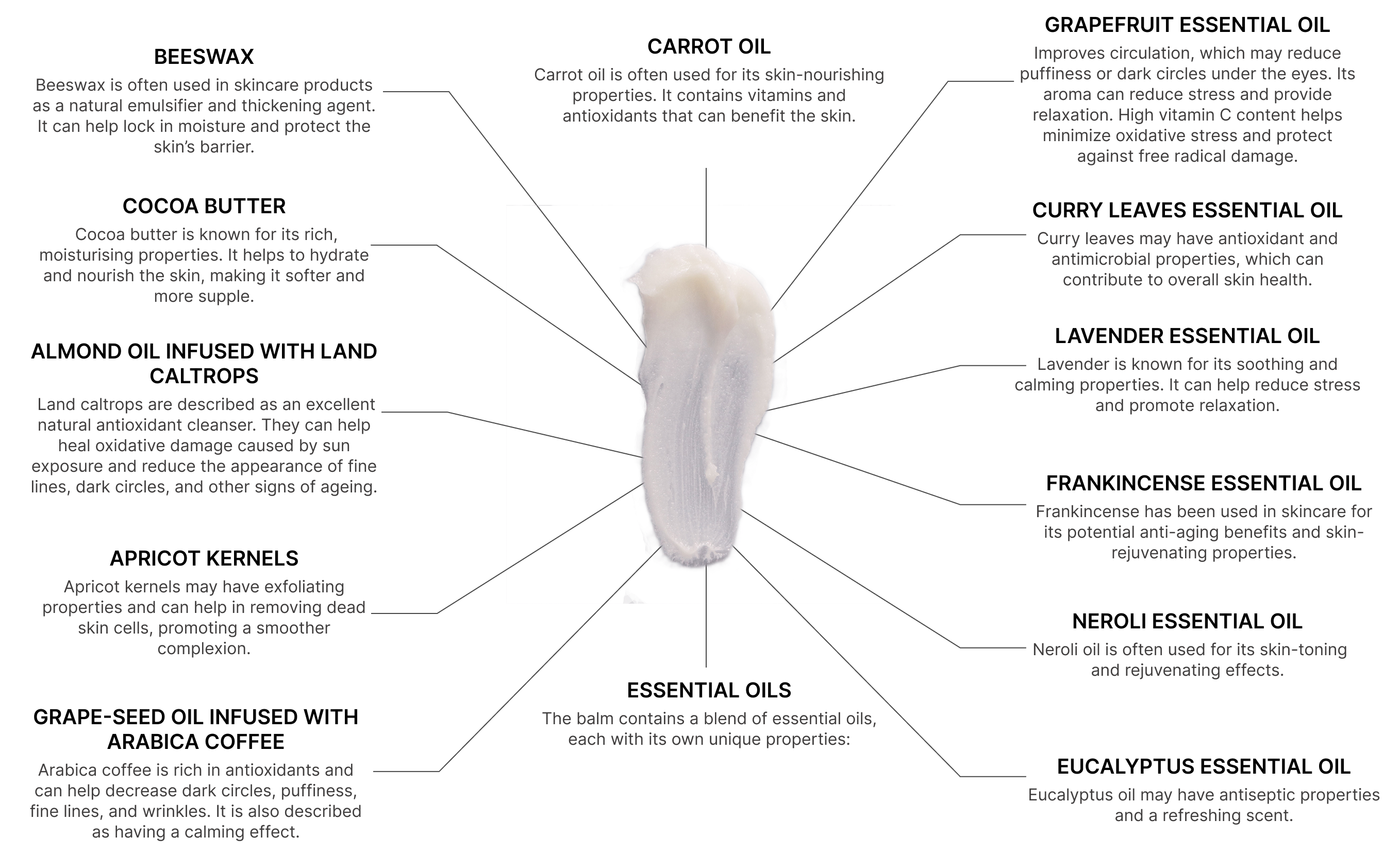Youthful Ingredients: The Eye Balm contains ingredients known for their potential benefits to the skin, such as cocoa butter, almond oil with caltrops, and grape-seed oil with Arabica coffee. These ingredients may contribute to skin nourishment and rejuvenation.