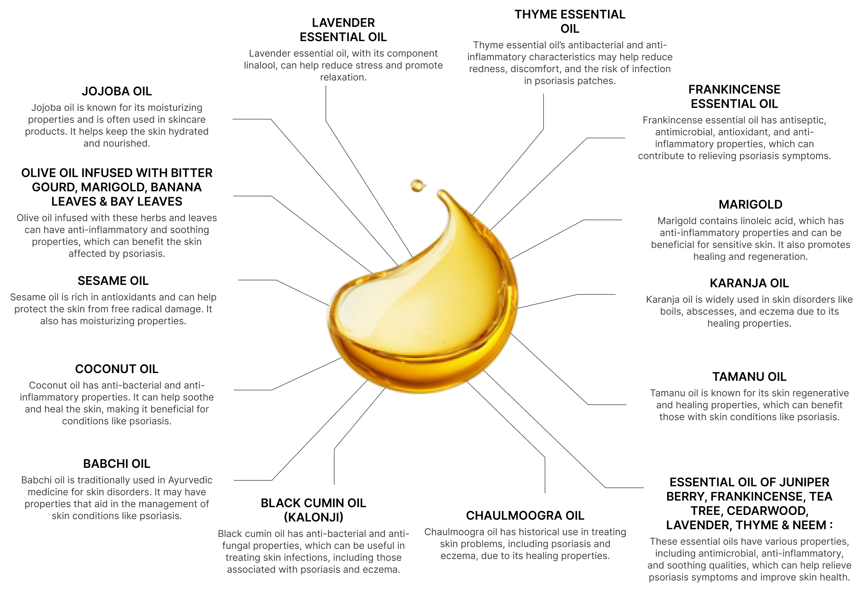 Helps to reduce swelling and heal Psoriasis symptoms. Swelling is another symptom often seen in psoriasis. This oil contains ingredients with anti-inflammatory properties that help reduce swelling and support the healing of psoriasis symptoms.